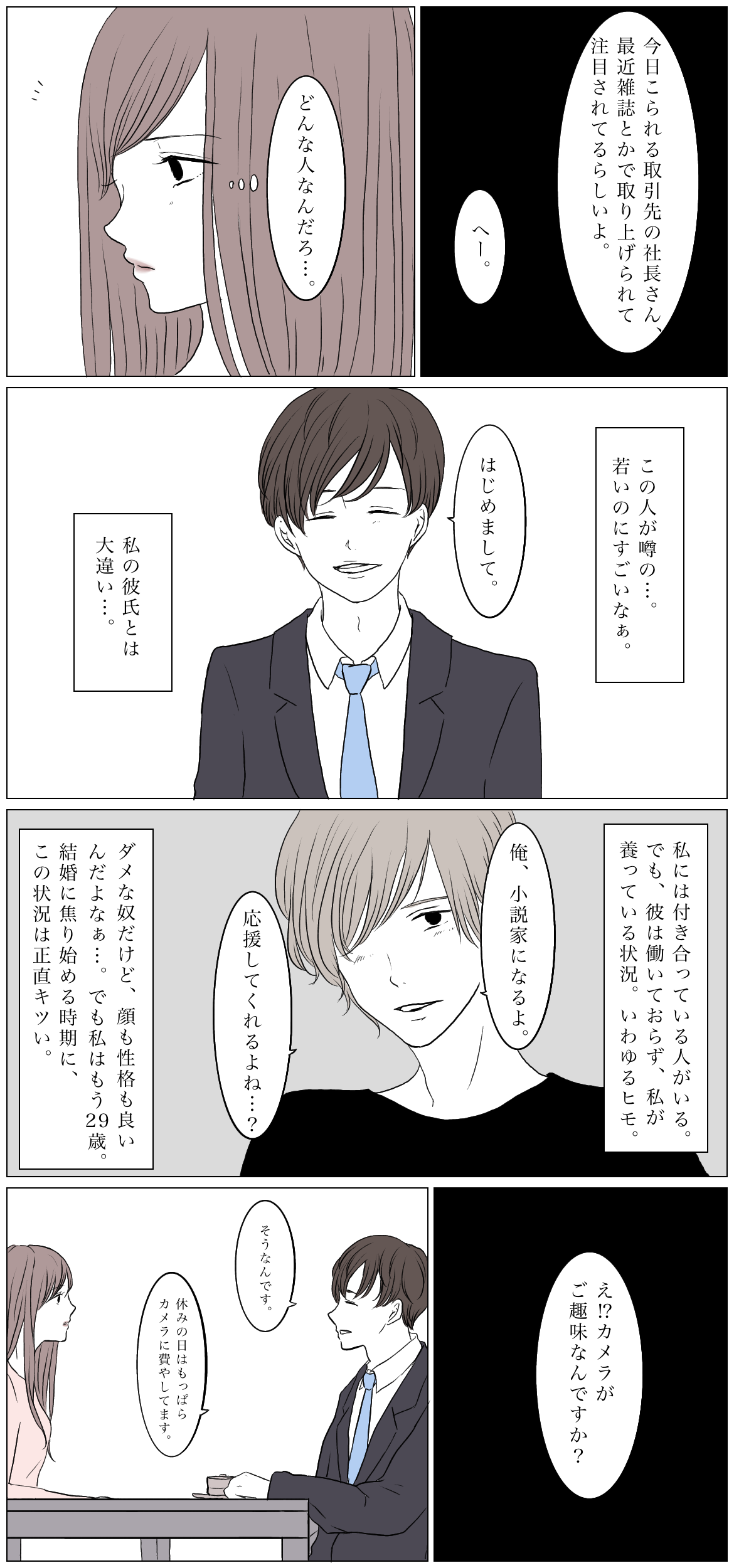 小説家になるために仕事を辞めたヒモ状態の彼と、将来の不安を抱きながらも別れられないでいる里奈。そんなときに出会った、将来を期待される実業家……。心優しきイケメンのヒモか、将来もお金にも期待が持てる若き社長か。人生の選択を迫られたときに、里奈が出した答えとは?