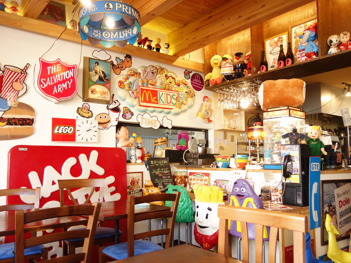 2階のカフェには、アメリカンアンティークな雑貨がディスプレイされ、まるでおもちゃ箱の中にいるよう。見ているだけでもワクワクしてしまう空間です。
