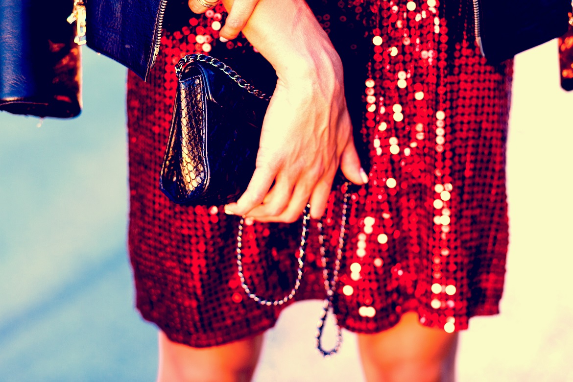 光沢のある革ジャン、スキニーパンツ、ピンヒール