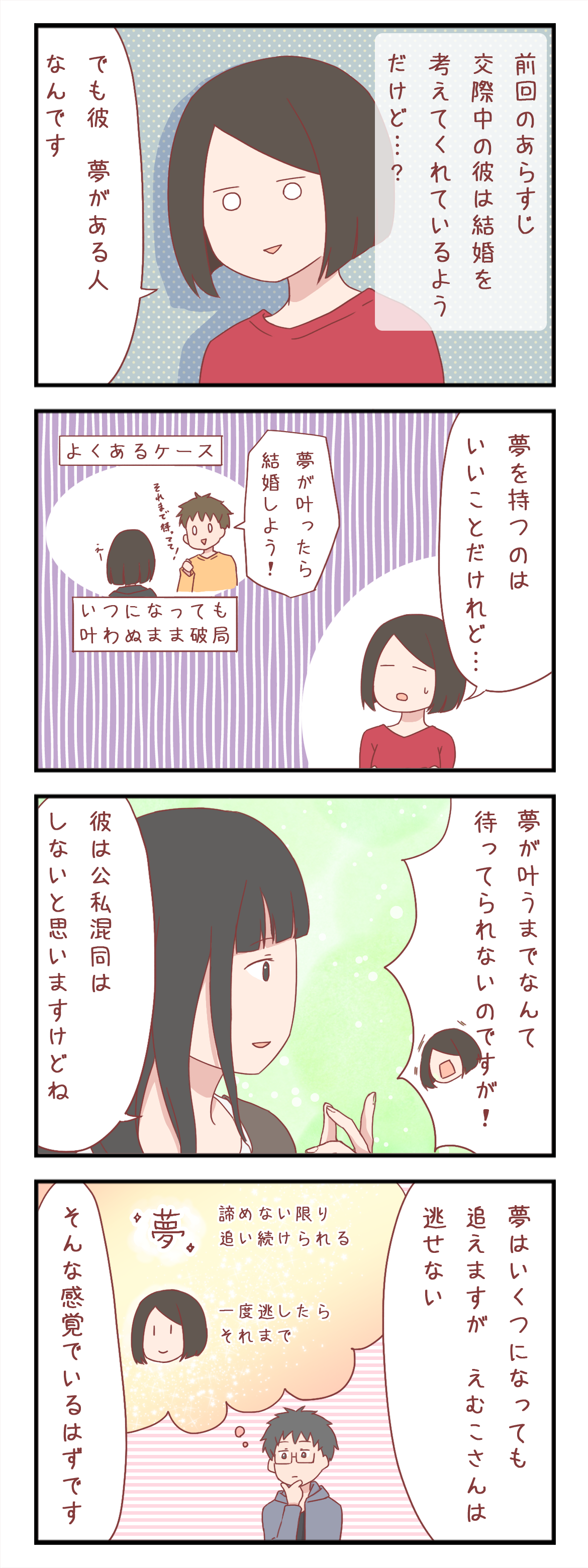 「夢が形になるまで結婚は……」という人だと、結婚まで長くかかりそうだなぁと思ってしまうのですが……。